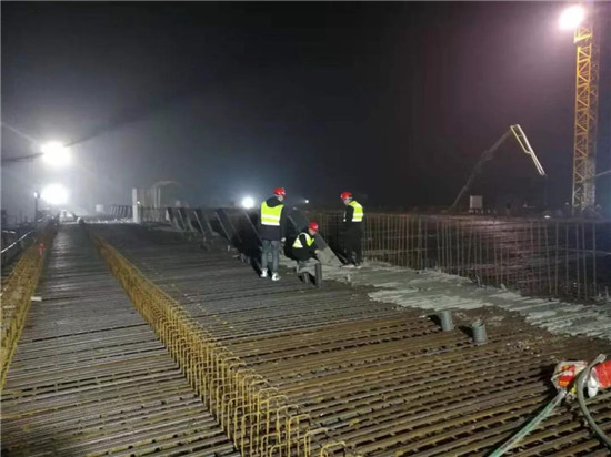 此次混凝土澆筑施工,襄陽東津片區全體員工高度重視,提前籌劃、精心組織、緊盯細節,合理安排施工工序,嚴格落實公司安全管理要求,項目經理、工區負責人、攪拌站負責人現場蹲守督導,確保全方位安全有序推進。澆筑期間雖遭遇雨雪天氣,但也沒有澆滅湖北工建人的熱情,反而越戰越勇,以“不破樓蘭終不還”的決心,經過三天四夜的連續奮戰,安全優質地完成了澆筑任務。